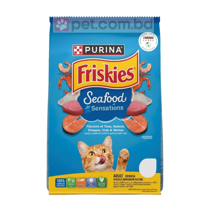 FRISKIES® Adult Seafood Sensations Dry Cat Food provides you the sensational taste of the jewels of the ocean. Comes in a flavour combination of tuna, salmon, whitefish, crab & shrimp that your cat will enjoy! FRISKIES® Adult Seafood Sensations provides your cat with complete and balanced nutrition. It contains protein, essential fatty acids with Omega 3 and 6, antioxidants, taurine, and calcium to meet your cat’s daily nutrition needs.