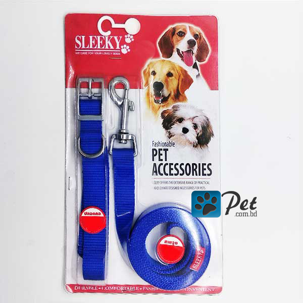 Sleeky Solid Nylon Dog Collar with Leash – Blue (16″)